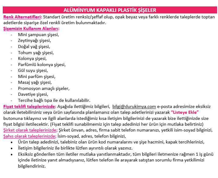 - Ürün Kodu: Alüminyum Kapaklı Plastik Şişe 25/30ml Kod 416