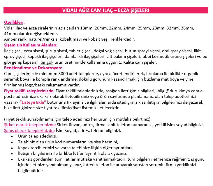 - Ürün Kodu: Kilitli Kapaklı Cam Renksiz İlaç Şişesi 50ml. Kod 4050