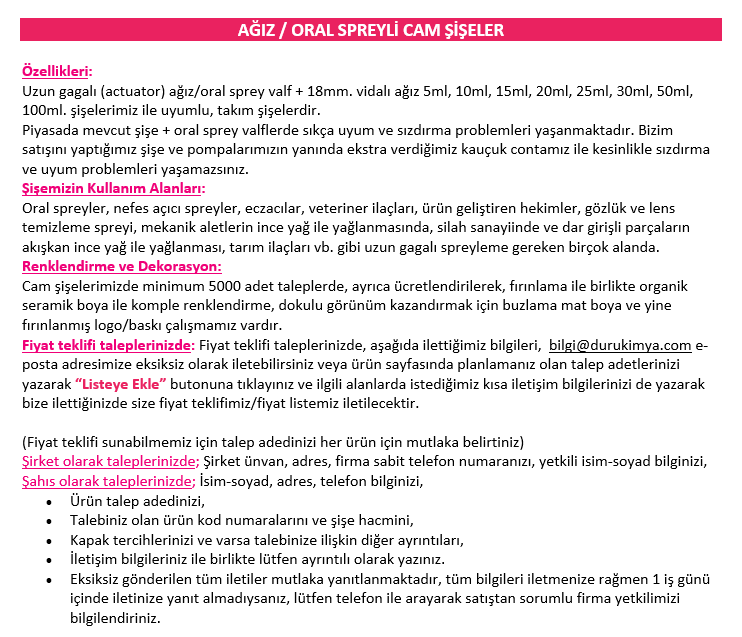 Etiketler: 30ml renksiz agiz spreyli cam şişe, 30ml renksiz oral spreyli şişe, 30ml renksiz boğaz spreyli cam şişe, 30ml renksiz uzun gagalı cam şişe, ağız sprey valfli ilaç şişesi Şişe, kod:, 4030, duruesans.com