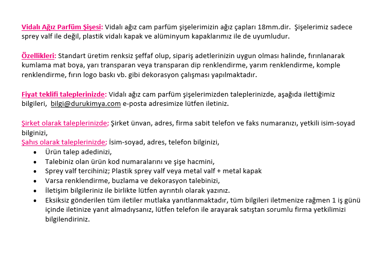 Etiketler: Duru Kimya, Cam şişe, 10ml parfüm şişesi, vidalı parfüm şişesi, 10ml sprey şişe, açık parfüm şişesi, screw glass bottle, screw perfume bottle, sprey valfli şişe, cam kolonya şişesi, ekonomik fiyatlar ile kod:, 4010, 10ml., alüminyum, spreyli, Şişesi, duruesans.com