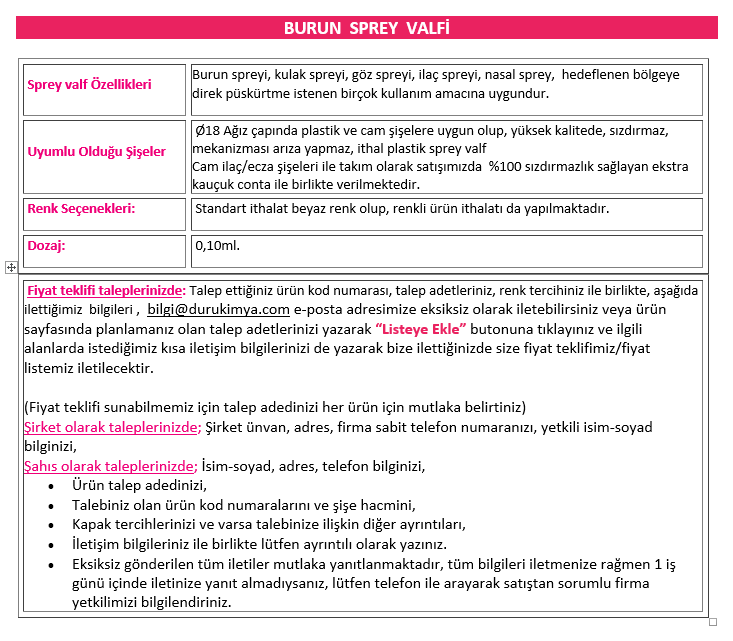 Etiketler: burun sprey valf, burun sprey pompa, nasal sprey, nasal pompa, burun spreyi, burun damlası pompası, sivri sprey pompa, göz spreyi pompası, ilaç spreyi ihtiyacınızda www.duruesans.com, BURUN SPREY VALFİ 18/410 BSP-418 valfİ, bsp-418, duruesans.com