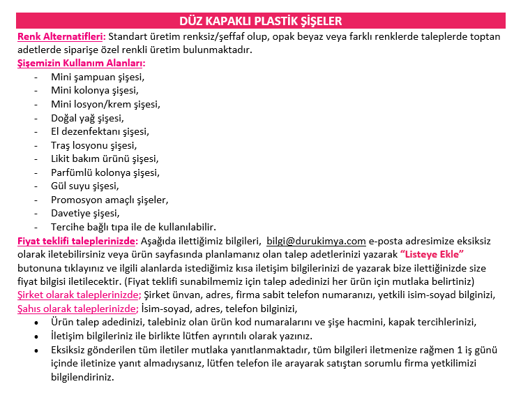 - Ürün Kodu: Düz Kapaklı + Tıpalı Plastik Şişe 25/30ml Kod 416